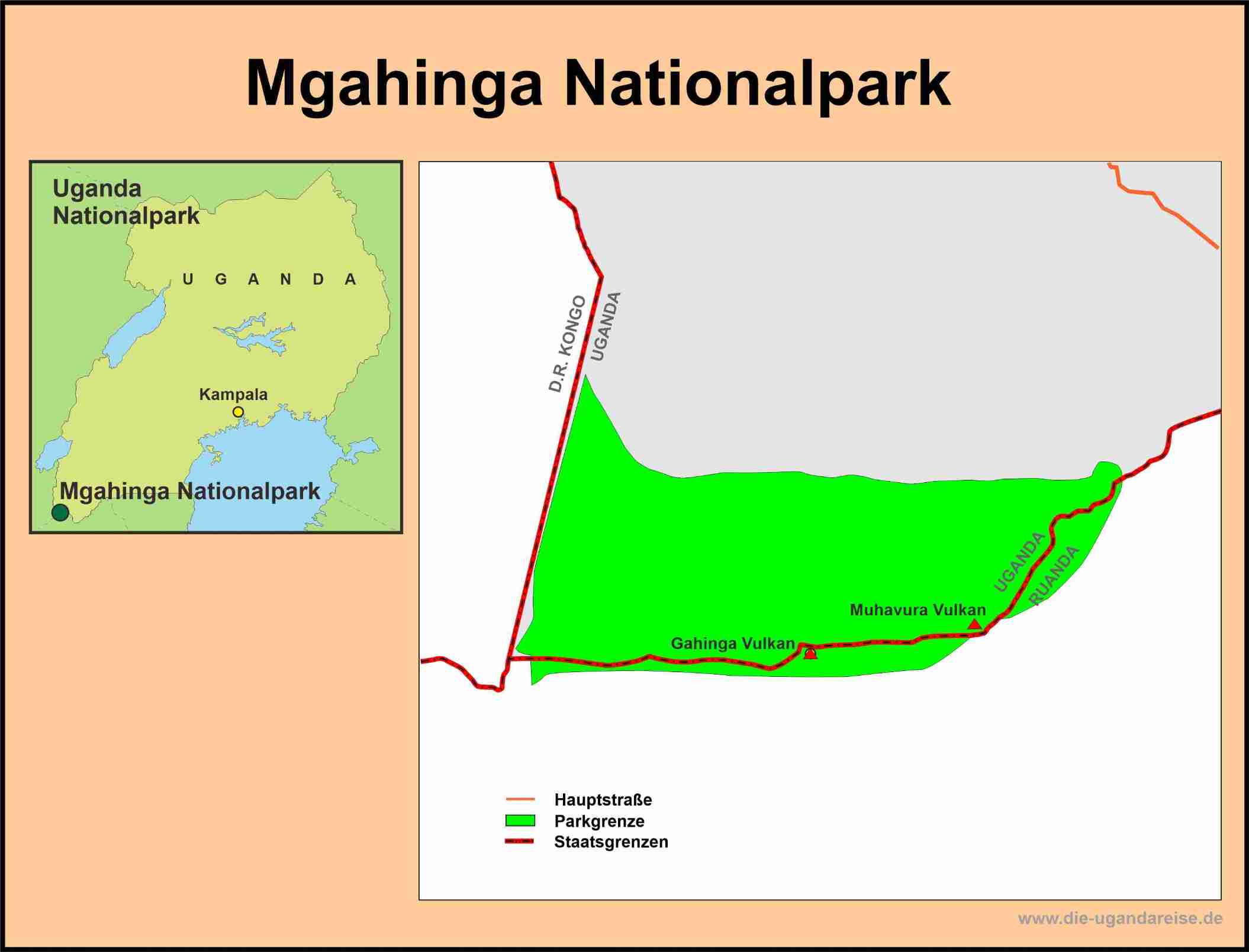 Das heutige Gebiet des Nationalparks wird von drei massiven Vulkanen geprägt. Sie sind inzwischen alle erloschen und ragen lediglich noch als eindrucksvolle Erhebungen empor. Sowohl der Gahinga als auch der Muhavura und Sabinyo lassen sich während eines Parkaufenthalts zu Fuß besteigen. Dazu sollte jedoch die Begleitung erfahrener Tourguides in Anspruch genommen werden. Oben auf einem der Vulkane angekommen, eröffnet sich ein eindrucksvoller Ausblick auf den Wald an den Vulkanhängen in seinem satten Grün und dichten Wuchs. Aufgrund der sehr dichten Vegetation in den Waldflächen ist der Park ideal für Fußsafaris geeignet. Mit Jeeps lässt sich nur ein Teil des Geländes befahren. Aus diesem Grund gibt es hier einige ausgebaute und ausgeschilderte Wanderwege. Die schönsten unter ihnen sind der Bamboo Trail und der Sabyinyo Gorge Trail. Ein eindrucksvoller Ort im Mgahinga Gorilla Nationalpark ist zudem die Garama-Höhle. Bei ihr handelt es sich um eine weitläufige Höhlenformation, die bis vor einiger Zeit von einem Volk der Batwa Pygmäen als Schutzhöhle genutzt wurde. Von ihrem Leben dort zeugen noch einige Überreste. Das Bergvolk ist inzwischen allerdings umgesiedelt und kann in ihrem neu entstandenen Dorf besucht werden.