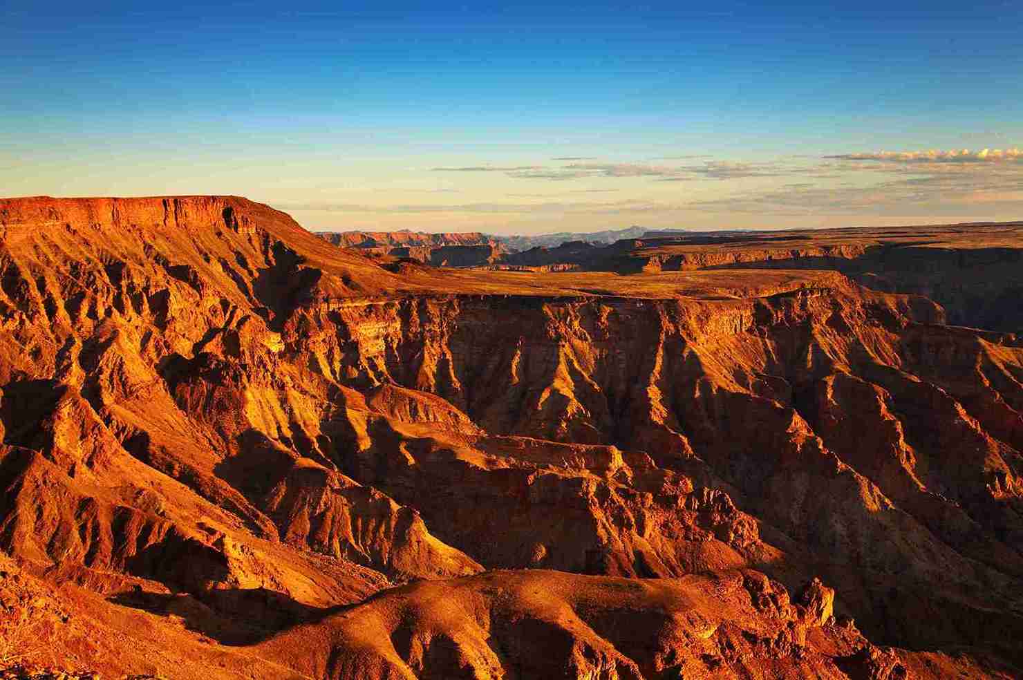 Der einsame Fish River Canyon im Süden ist an Größe und Erhabenheit nur noch vom Grand Canyon übertroffen. Von dort ist es nur ein Katzensprung nach Lüderitze, wo die Geisterstadt Kolmanskop auf Besucher eine große Faszination ausübt. Es boomte während des Goldrausches, wird aber heute teilweise von der vordringenden Wüste zurückerobert.