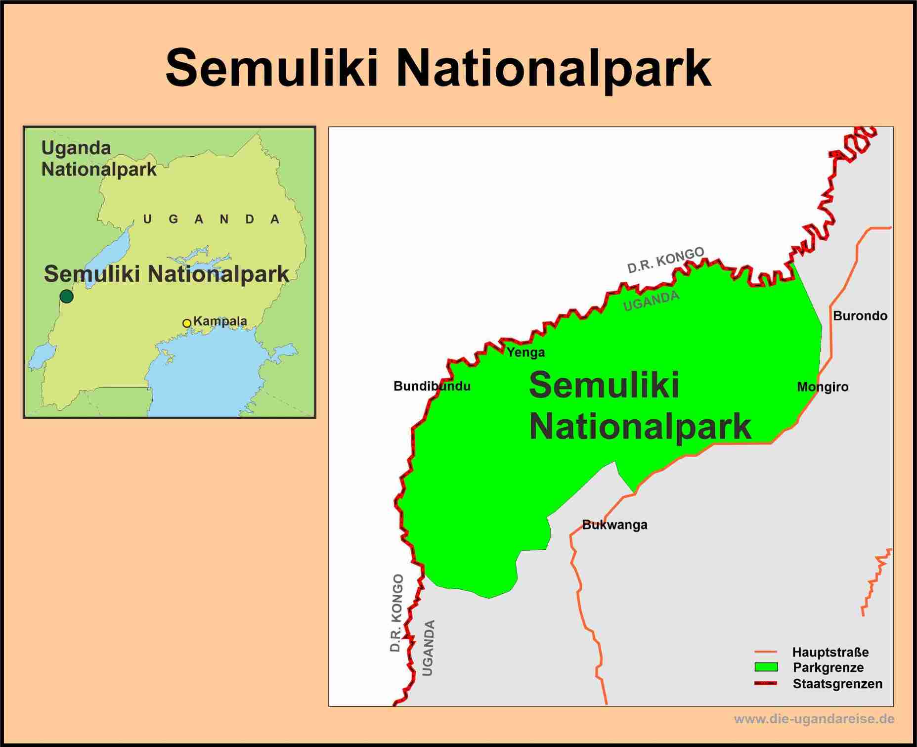 Das Landschaftsbild des Semuliki Nationalparks wird geprägt vom tropischen Regenwald, der hier den Namen Semuliki trägt. Gerade zum Ende der Regenzeit hin erstrahlt der Wald in sattem Grün und wird in den Morgenstunden von Nebelschwaden durchzogen. Dichter Unterwachs macht einige Bereiche des Waldes für Menschen nur sehr schwer zugänglich. Ein Naturspektakel der besonderen Art sind die heißen Quellen von Sempaya. Gleich zwei dieser Quellen sind im Park zu finden und liegen weniger als einen Kilometer voneinander entfernt. An einer von ihnen schießt das heiße Wasser direkt aus dem Gestein und glitzert im Sonnenschein. Die beiden heißen Quellen lassen sich am besten zu Fuß auf einem Trekkingweg besichtigen. Eine kleine Gemeinschaft von Pygmäen hat ihr nomadisches Lebens bereits vor einigen Jahren aufgegeben und siedelt seitdem im Randgebiet des Nationalparks. Im Rahmen von geführten Touren ist ein Kontakt mit ihnen möglich, um mehr über ihre Rituale und Traditionen zu erfahren.